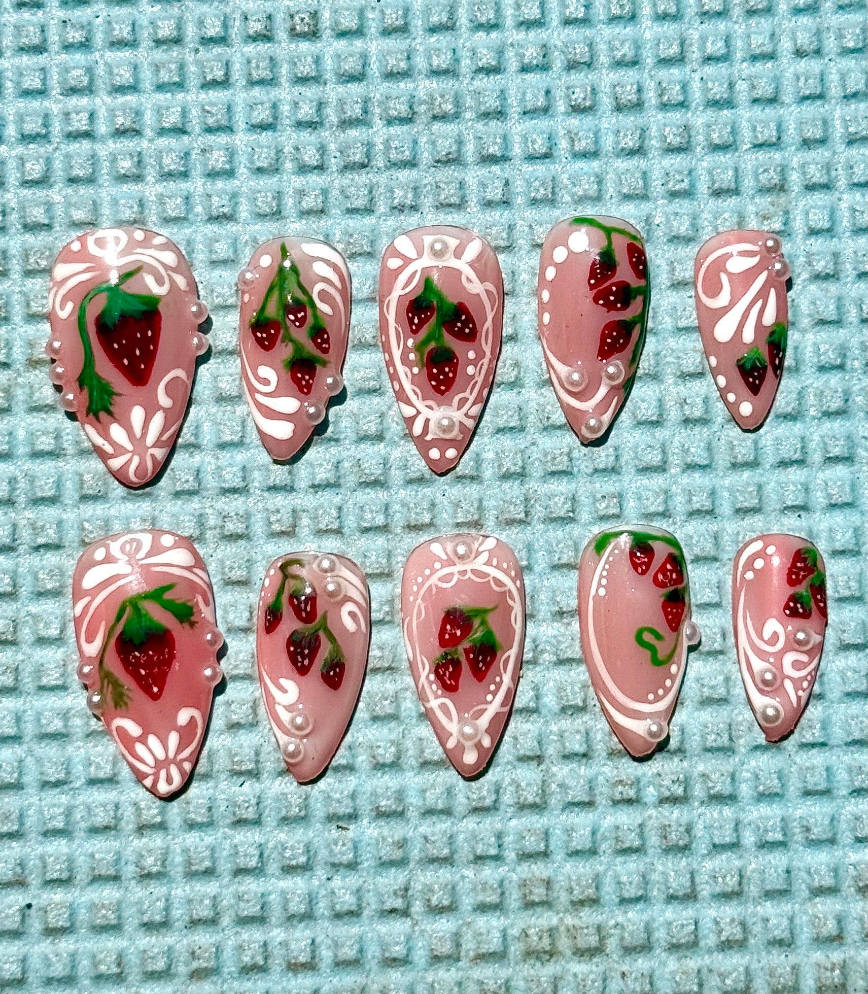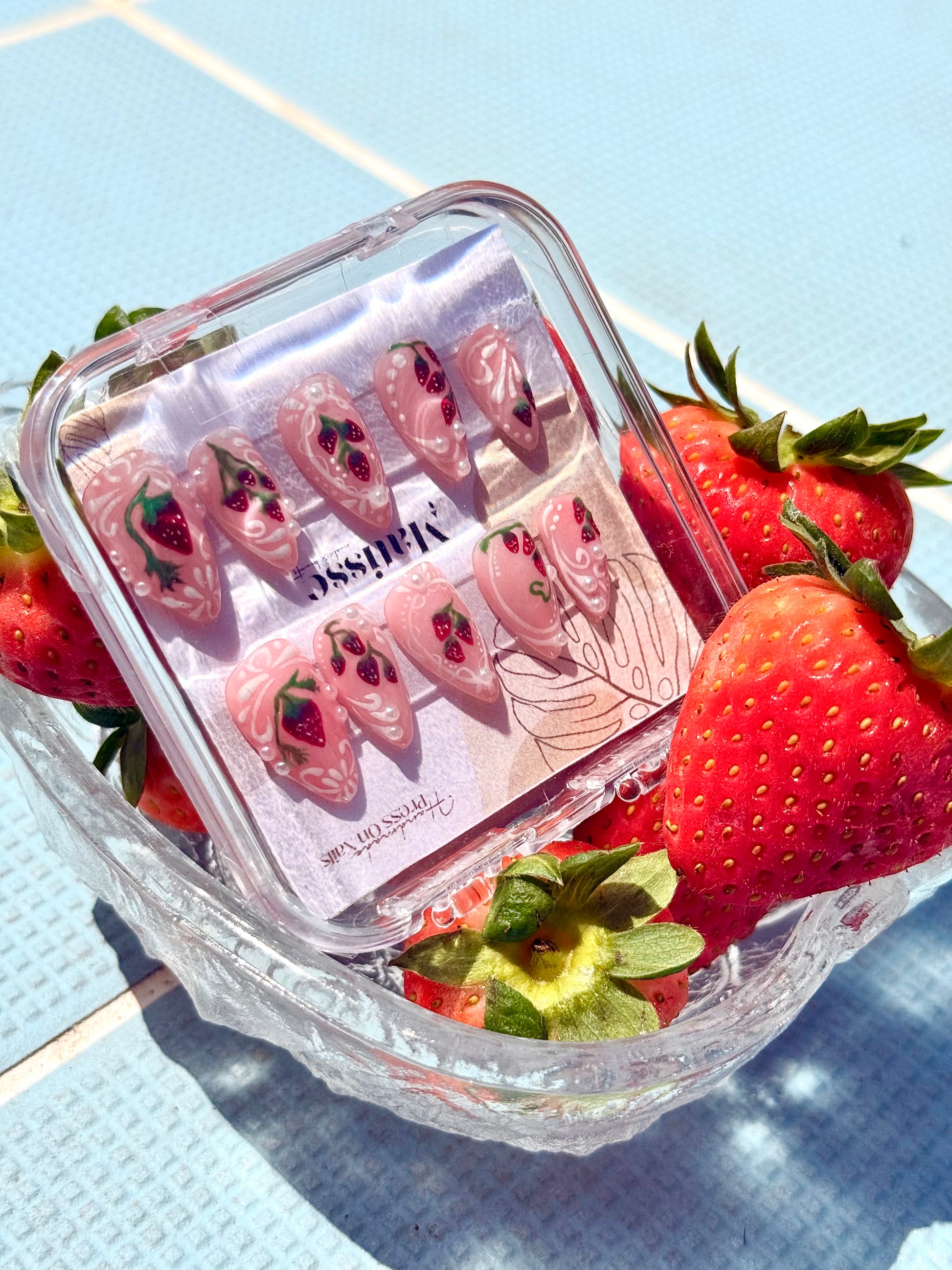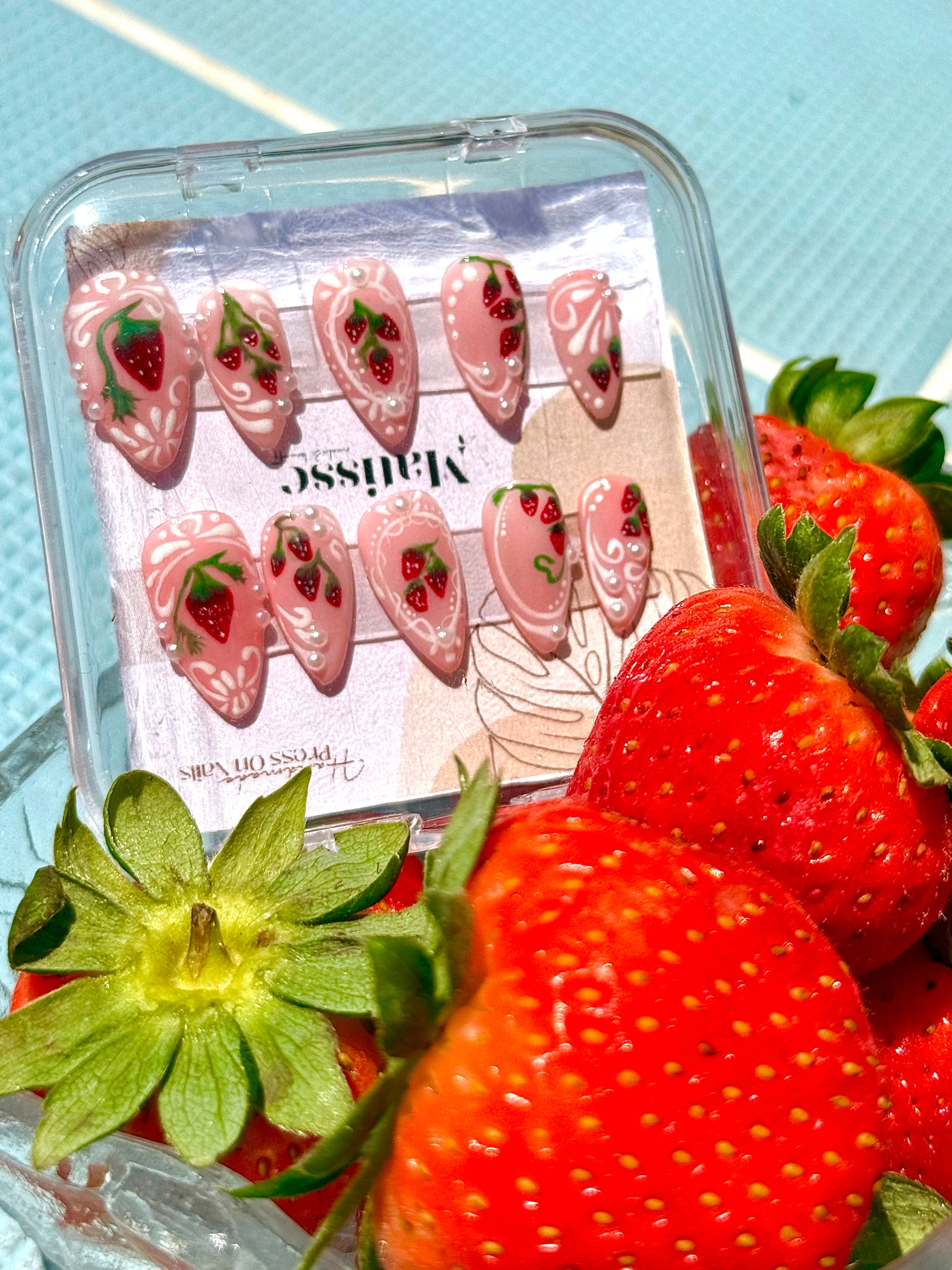 Estas press on nails con diseño de fresitas son el toque perfecto para darle sabor a tus días soleados. Fáciles de aplicar, cómodas y 100% cute. ¡Llévate el verano en las manos!