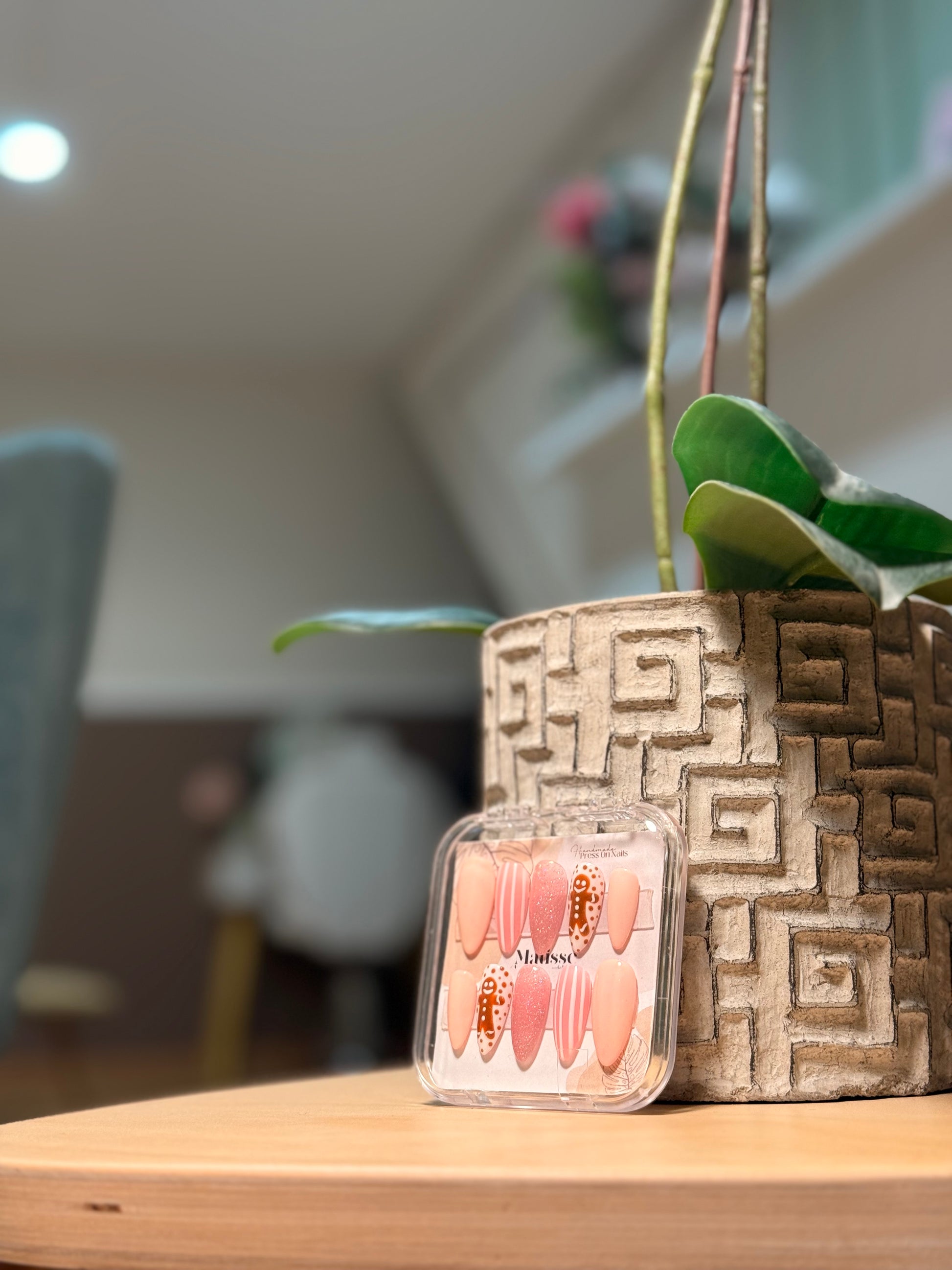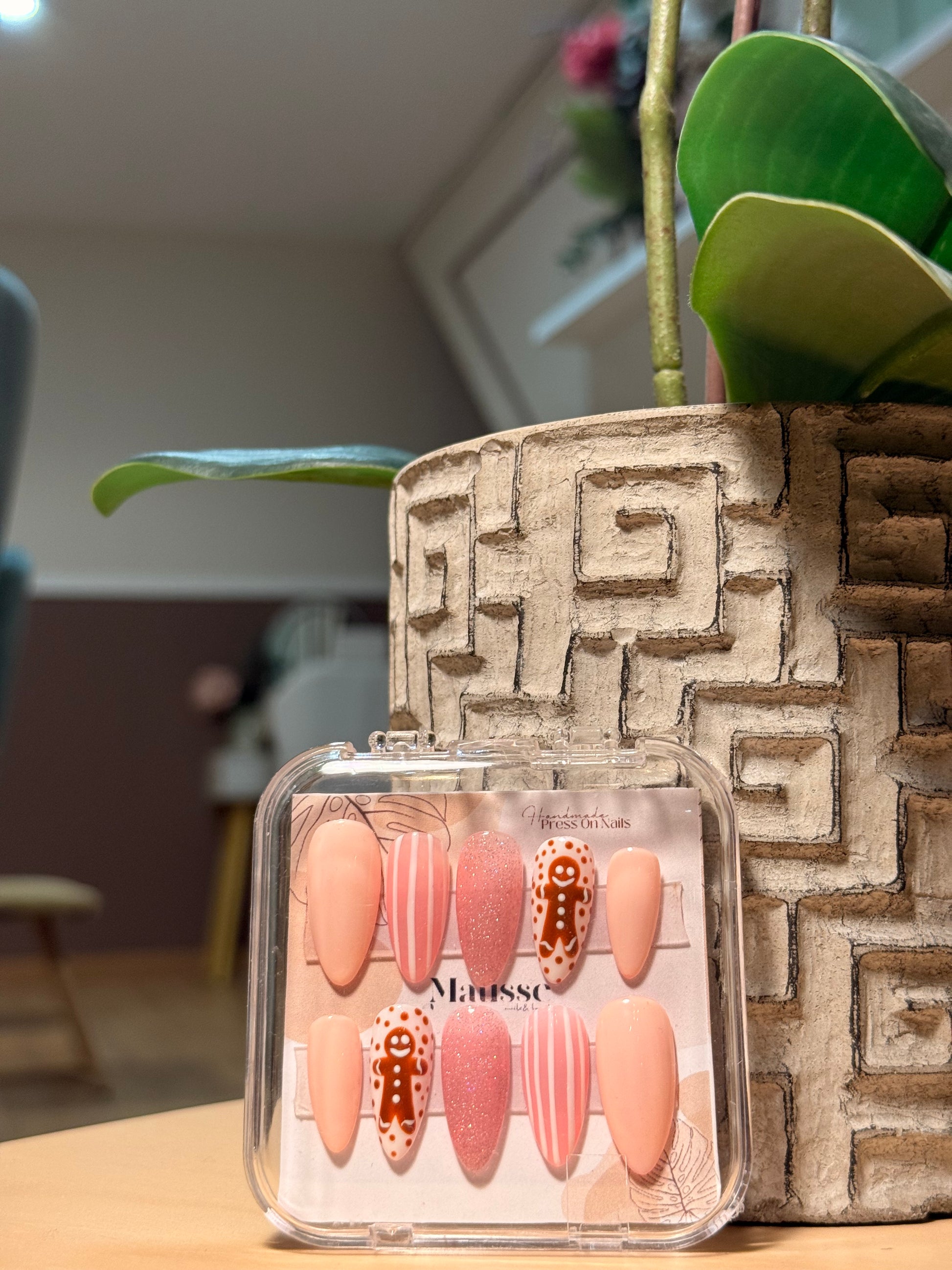 Ginger Cookie es un set de uñas Press On inspirado en el encanto de la Navidad más dulce. Con una base suave y detalles cálidos, este diseño destaca por sus galletitas de jengibre pintadas a mano, acompañadas de elementos delicados que aportan un aire divertido y acogedor.