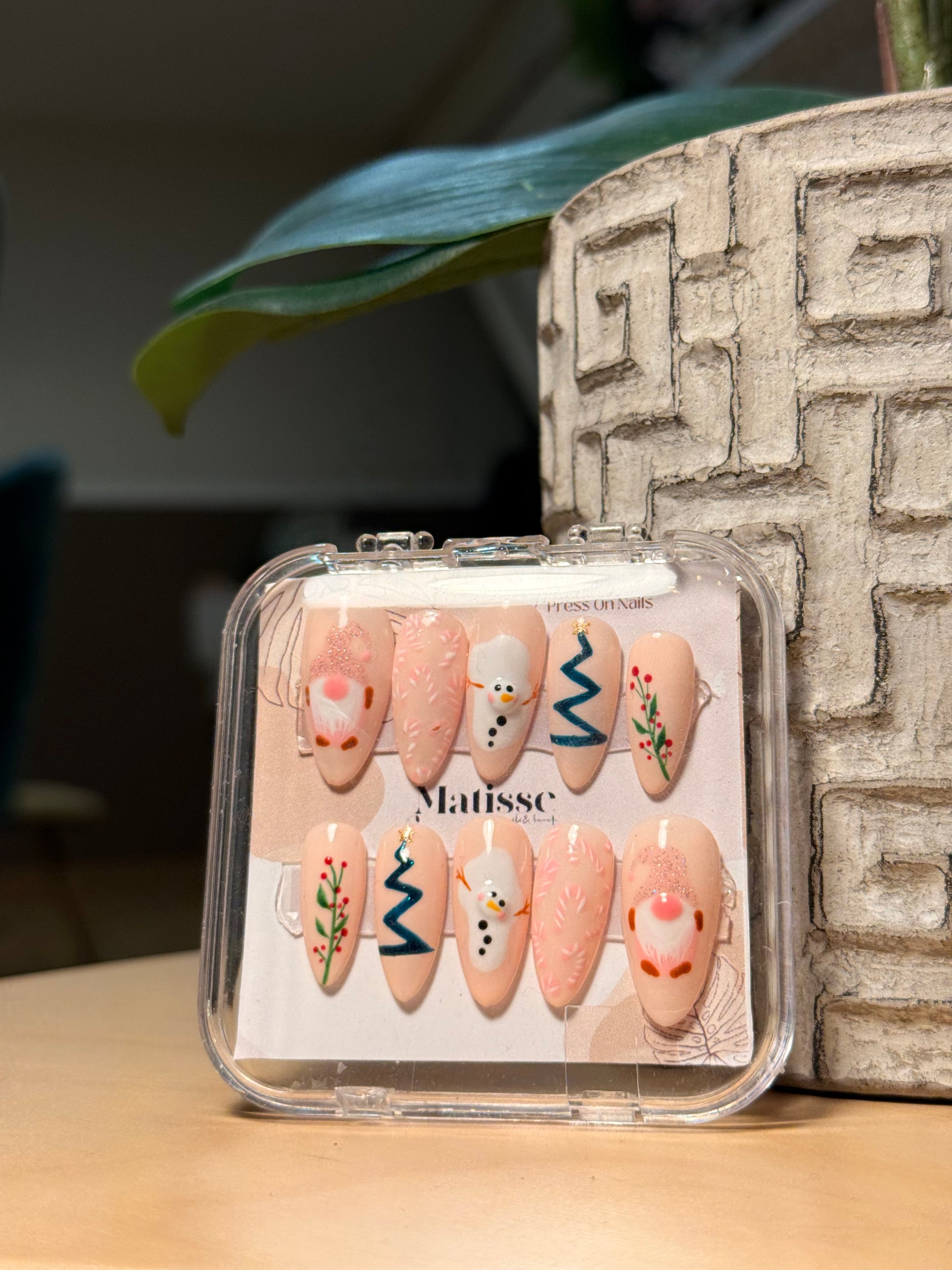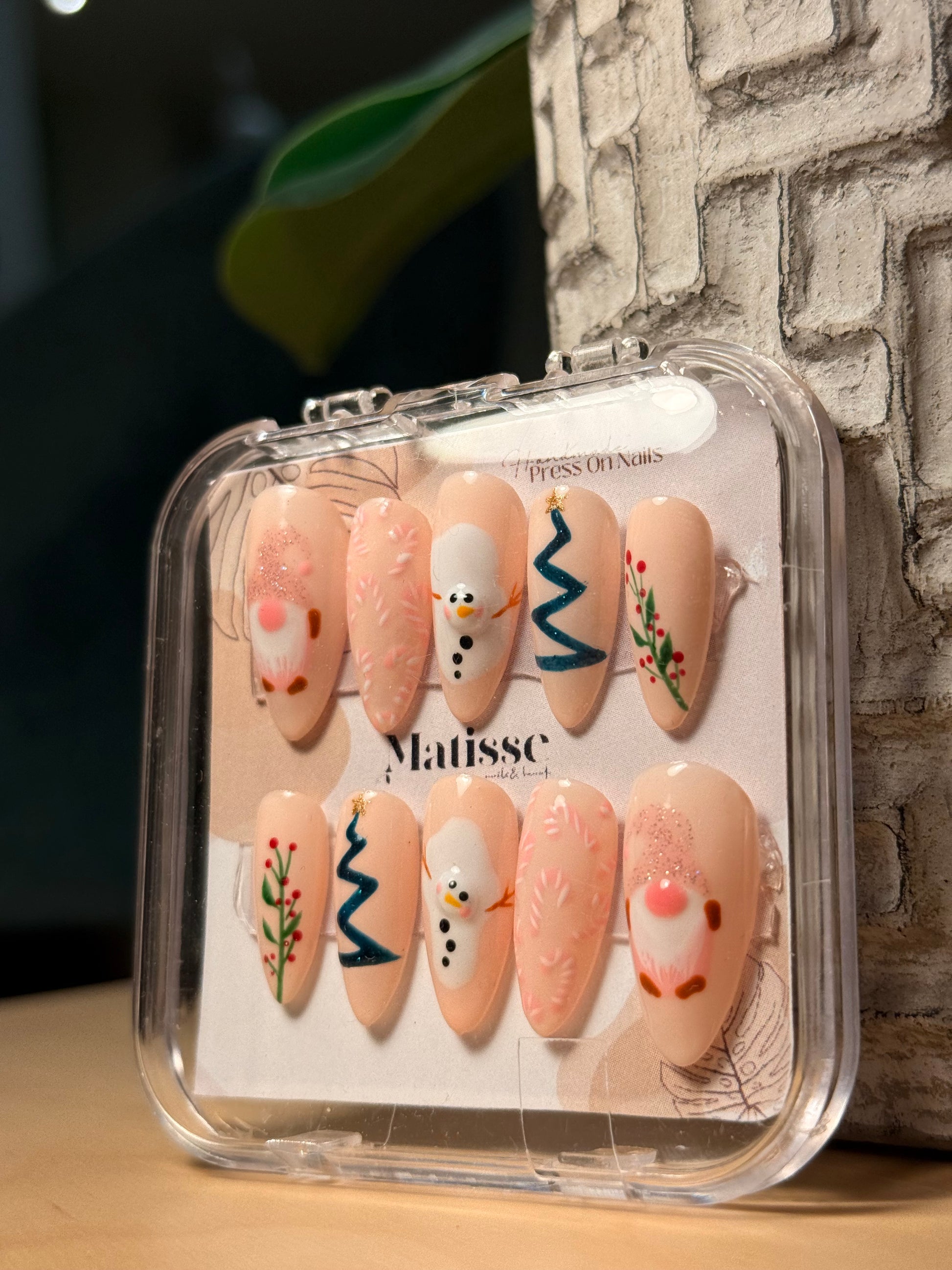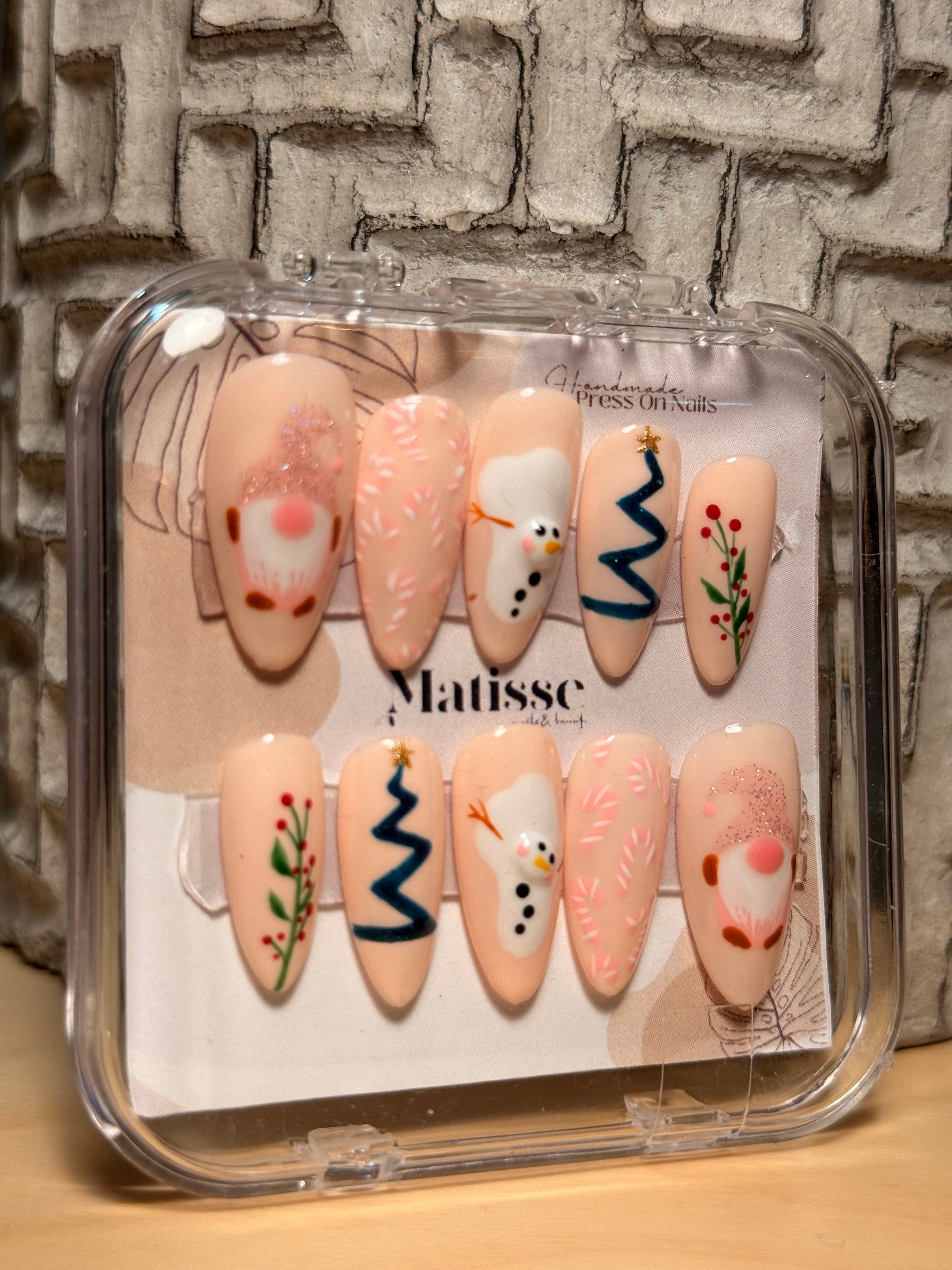 Encantador diseño con base nude suave y motivos navideños hechos a mano: pequeños muñecos de nieve, árboles festivos y detalles delicados que transmiten ternura y espíritu invernal. Ideal para quienes buscan un toque adorable sin perder sofisticación.