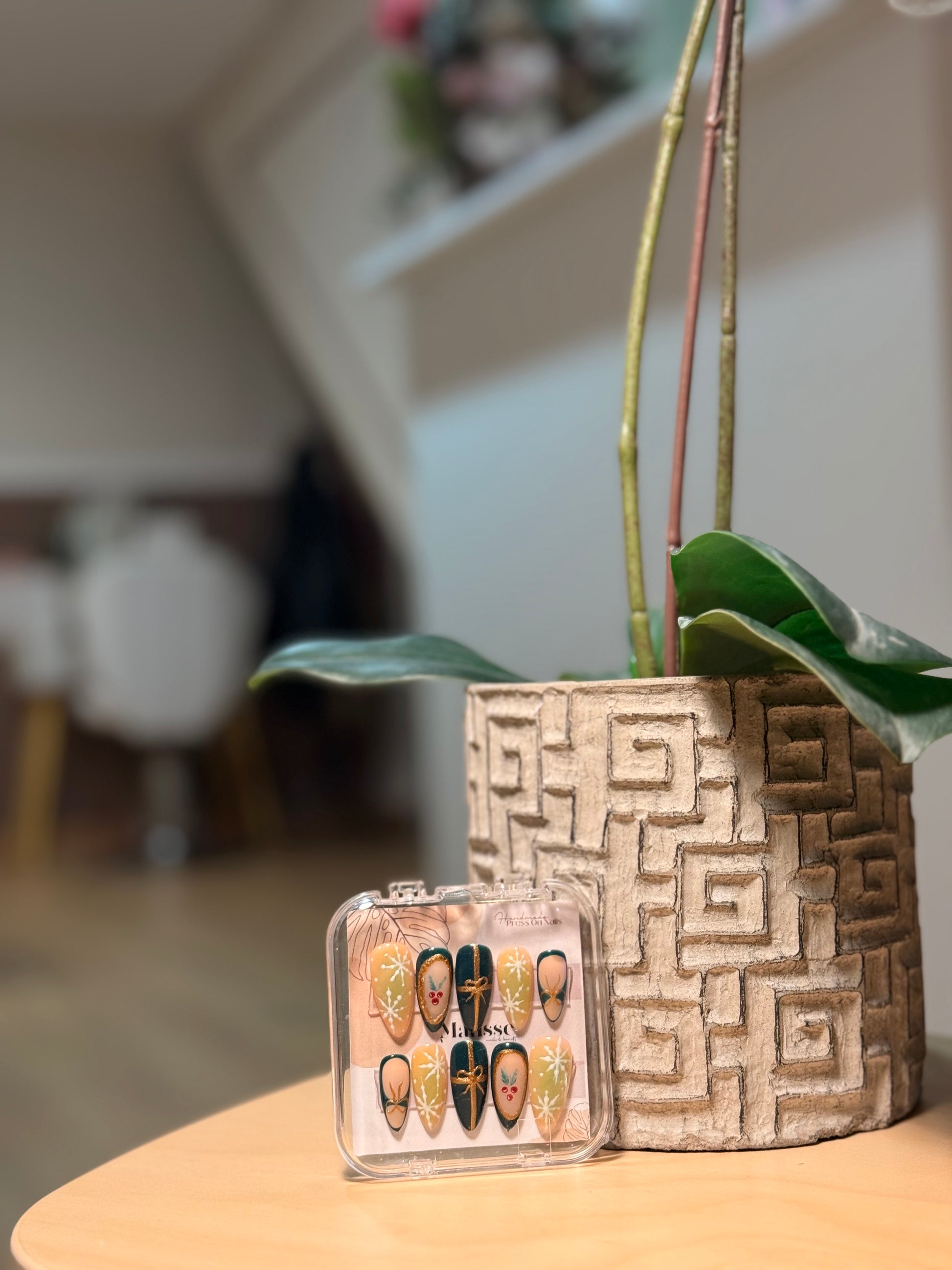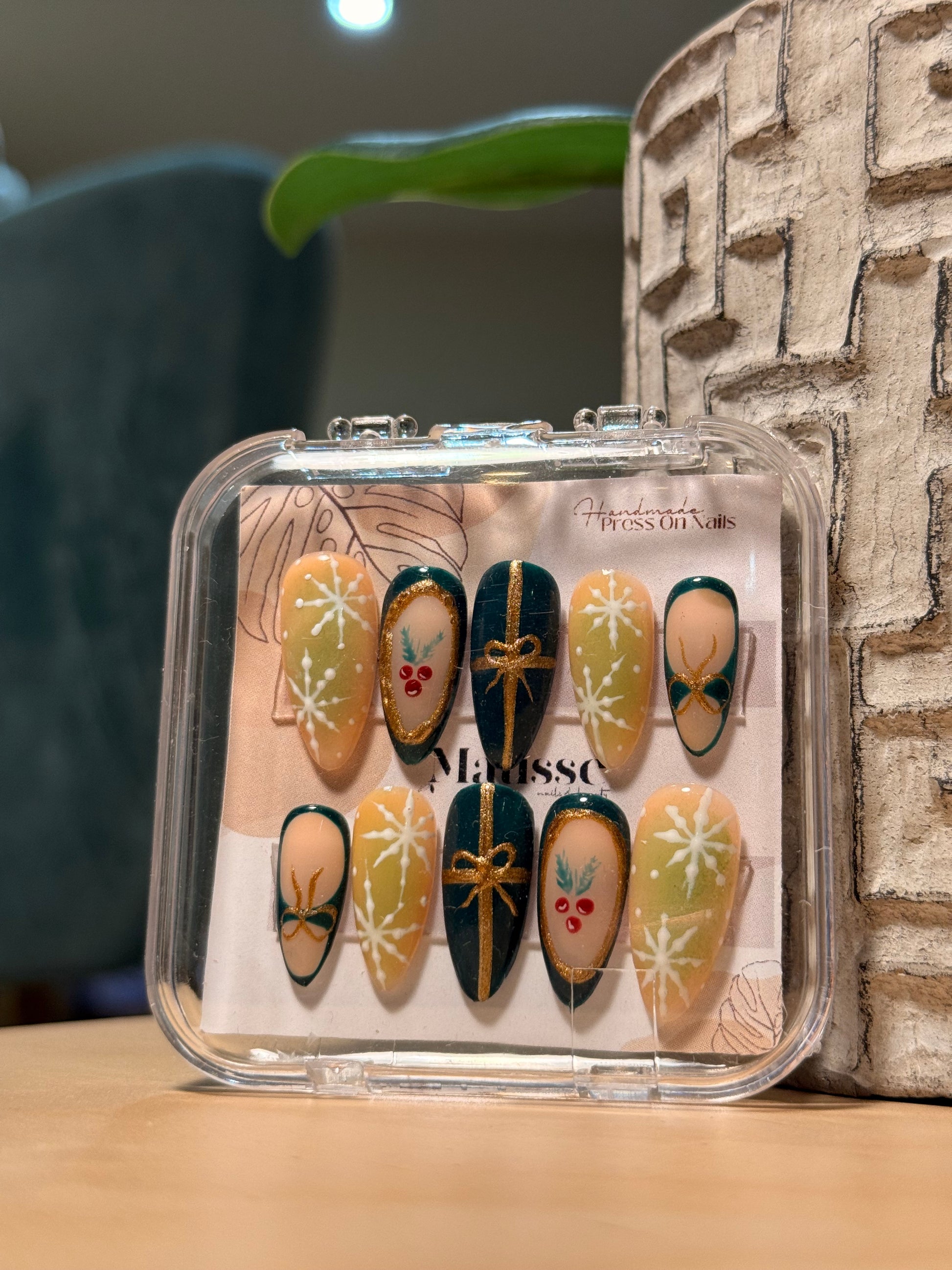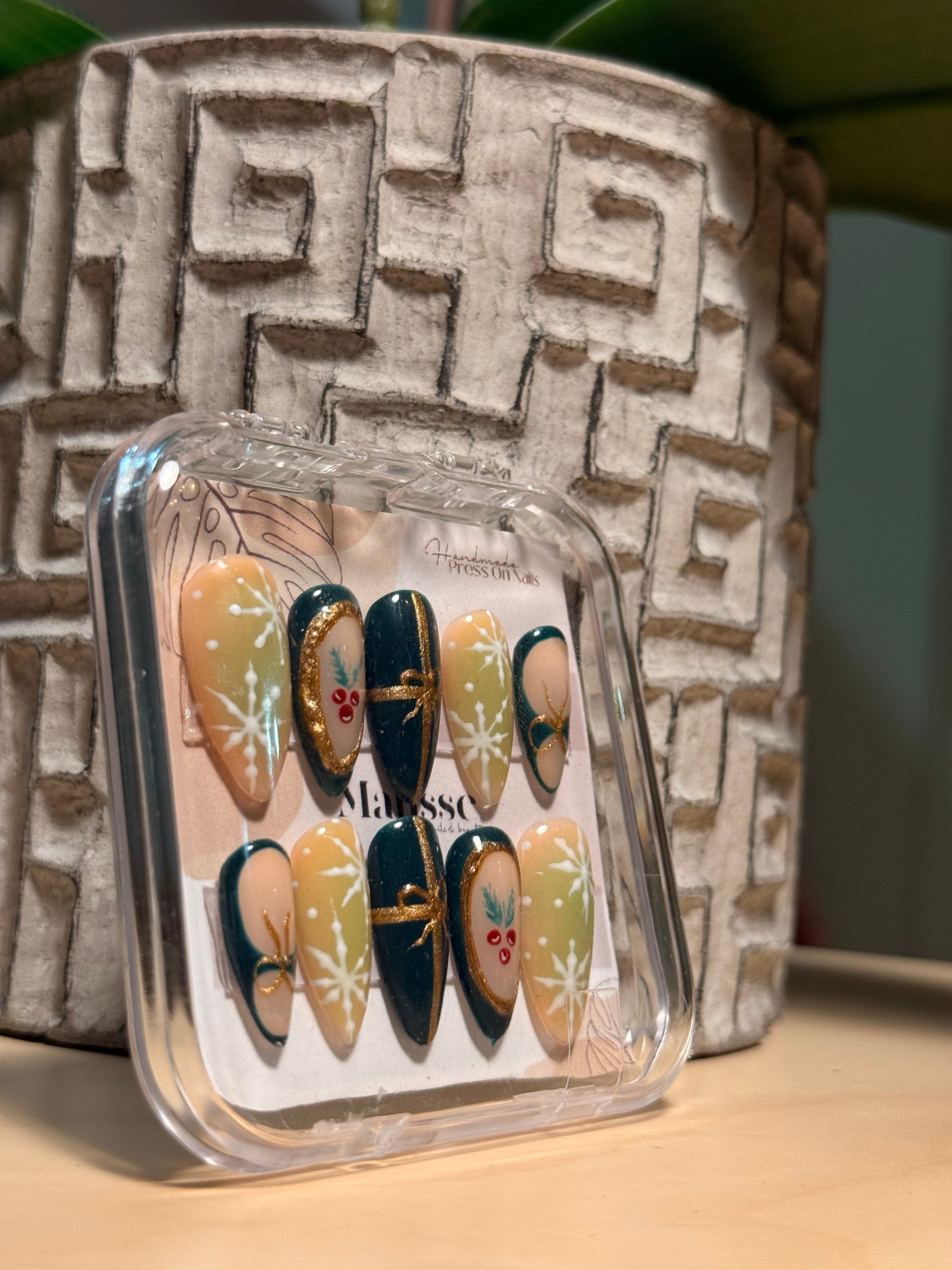 Un set con una paleta inspirada en las fiestas: verde oscuro profundo, toques dorados y detalles navideños delicados hechos a mano. Son uñas con presencia, brillo y personalidad, perfectas para looks más sofisticados y especiales.