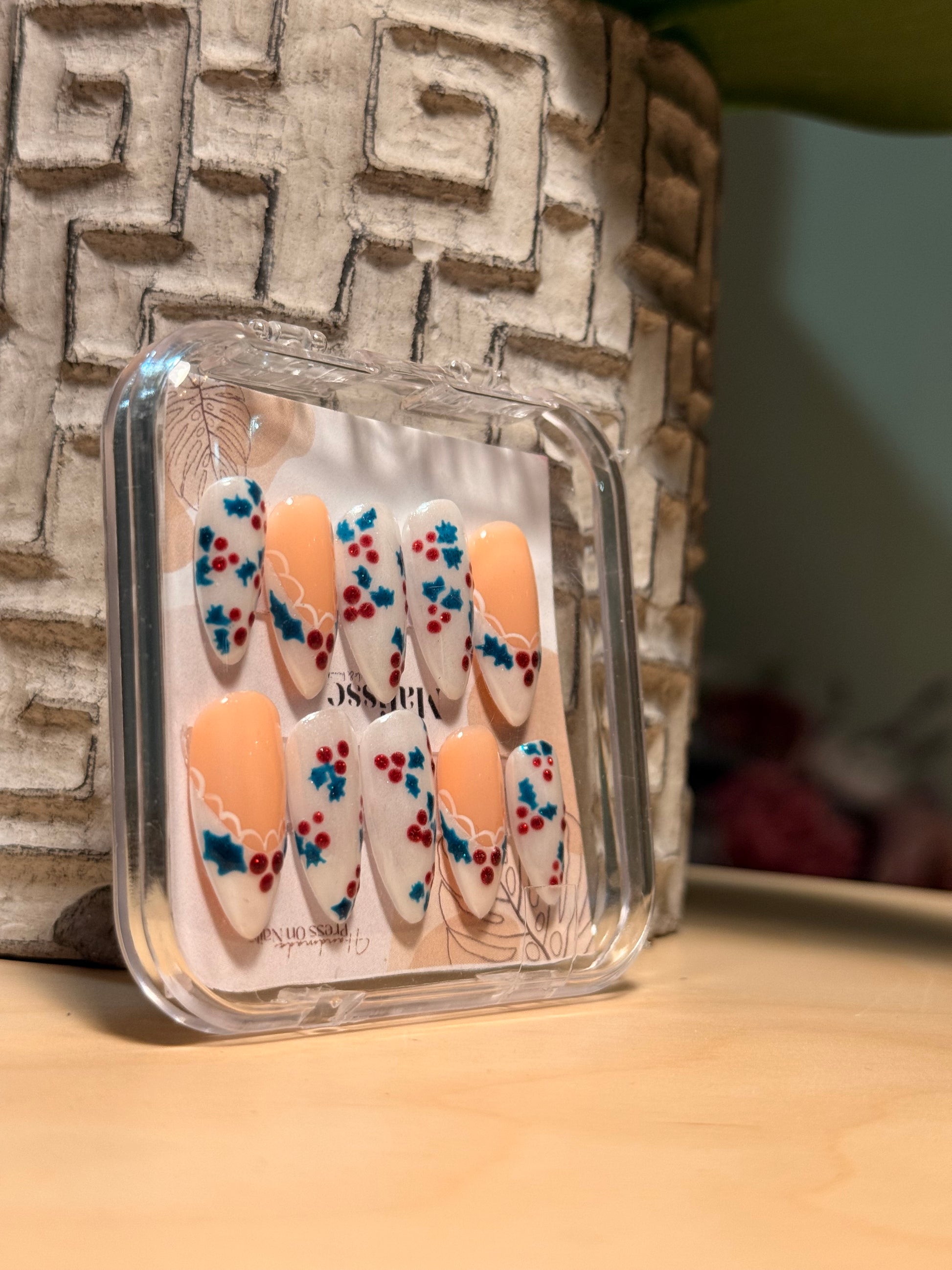 Sobre esta base nacen hojas de muérdago pintadas a mano, con pequeños detalles que aportan contraste y profundidad sin perder la esencia romántica del diseño. Cada uña está cuidadosamente trabajada para lograr un equilibrio perfecto entre sofisticación y espíritu navideño.